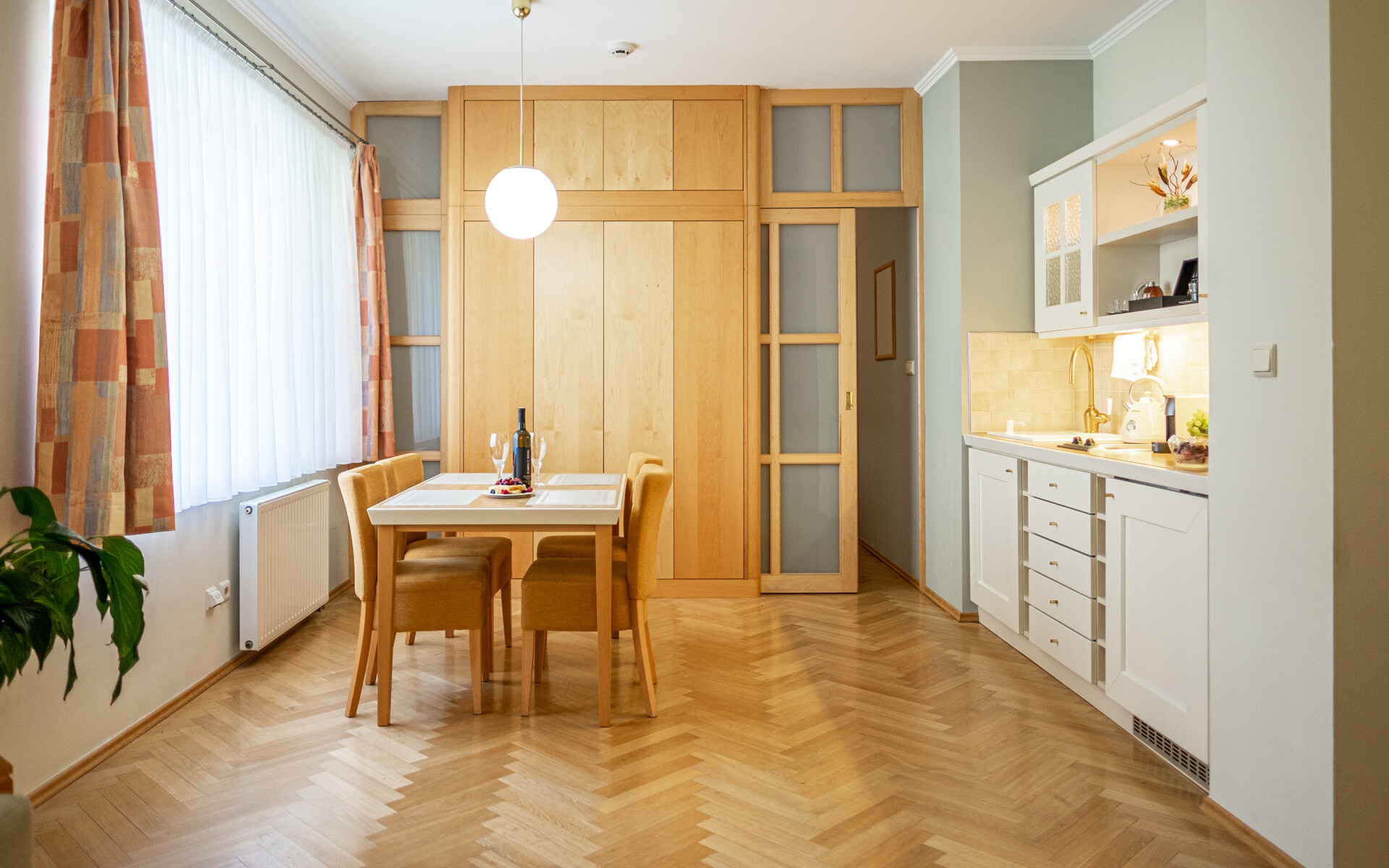 Masivní nábytek na míru a parkety na Vás udělají dokonalý dojem. Perlou každého apartmánu je designová koupelna Villeroy & Boch. Některé apartmány mají i balkony. Všechny pokoje mají velkou komfortní postel s kvalitními matracemi, na kterých se vám bude spát jako v pohádce.