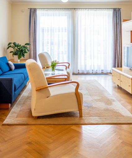 Masivní nábytek na míru a parkety na Vás udělají dokonalý dojem. Perlou každého apartmánu je designová koupelna Villeroy & Boch. Některé apartmány mají i balkony. Všechny pokoje mají velkou komfortní postel s kvalitními matracemi, na kterých se vám bude spát jako v pohádce.